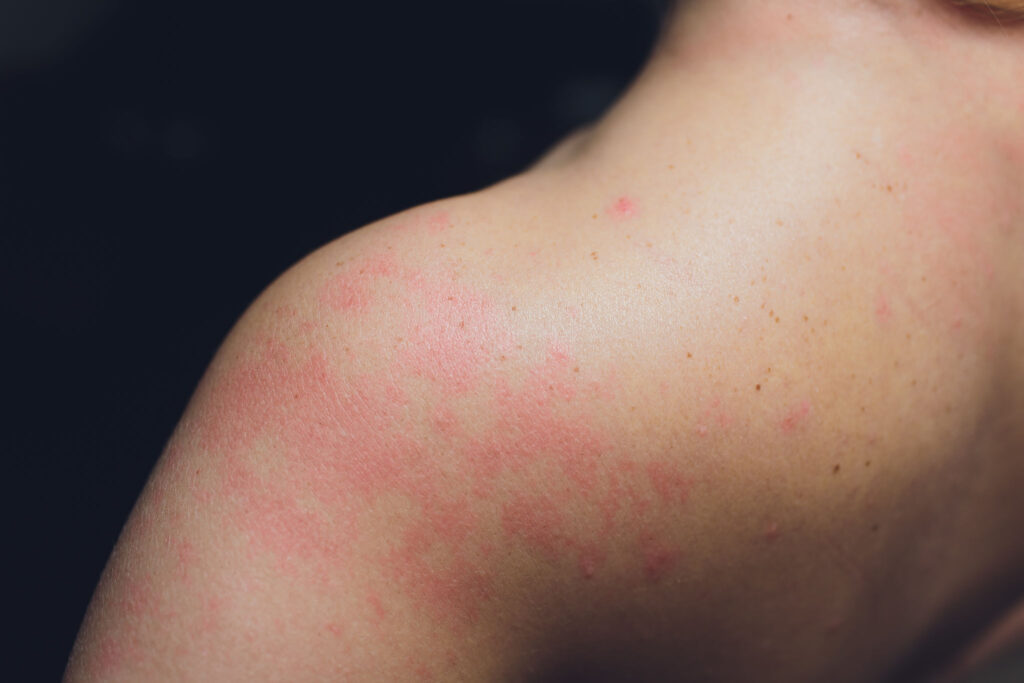 Urticaria commonly referred to as hives, is a kind of  skin rash notable for pale red, raised, itchy bumps. Hives typically last less than 4 hours but an individual lesion may last for up to 24 hours and the whole process may stay for days or weeks.