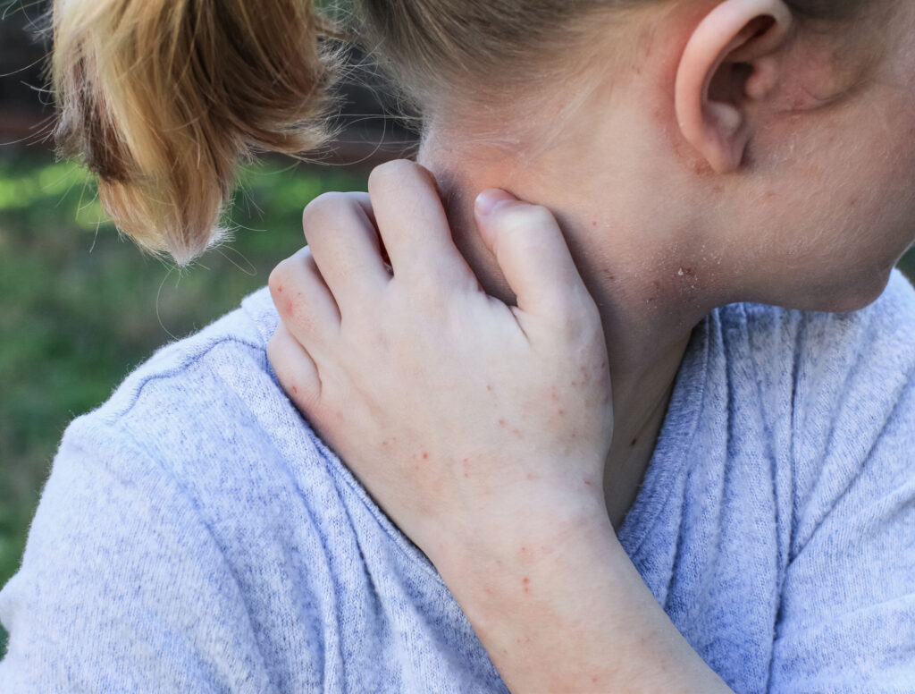 lichenification and/or excoriations (secondary to relentless scratching)